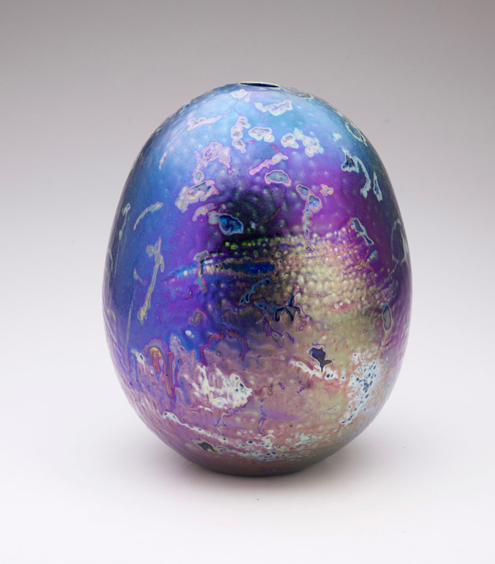 The surfaces are achieved through lustre glazes containing silver and copper that when reduced in a third firing transform giving the colours.