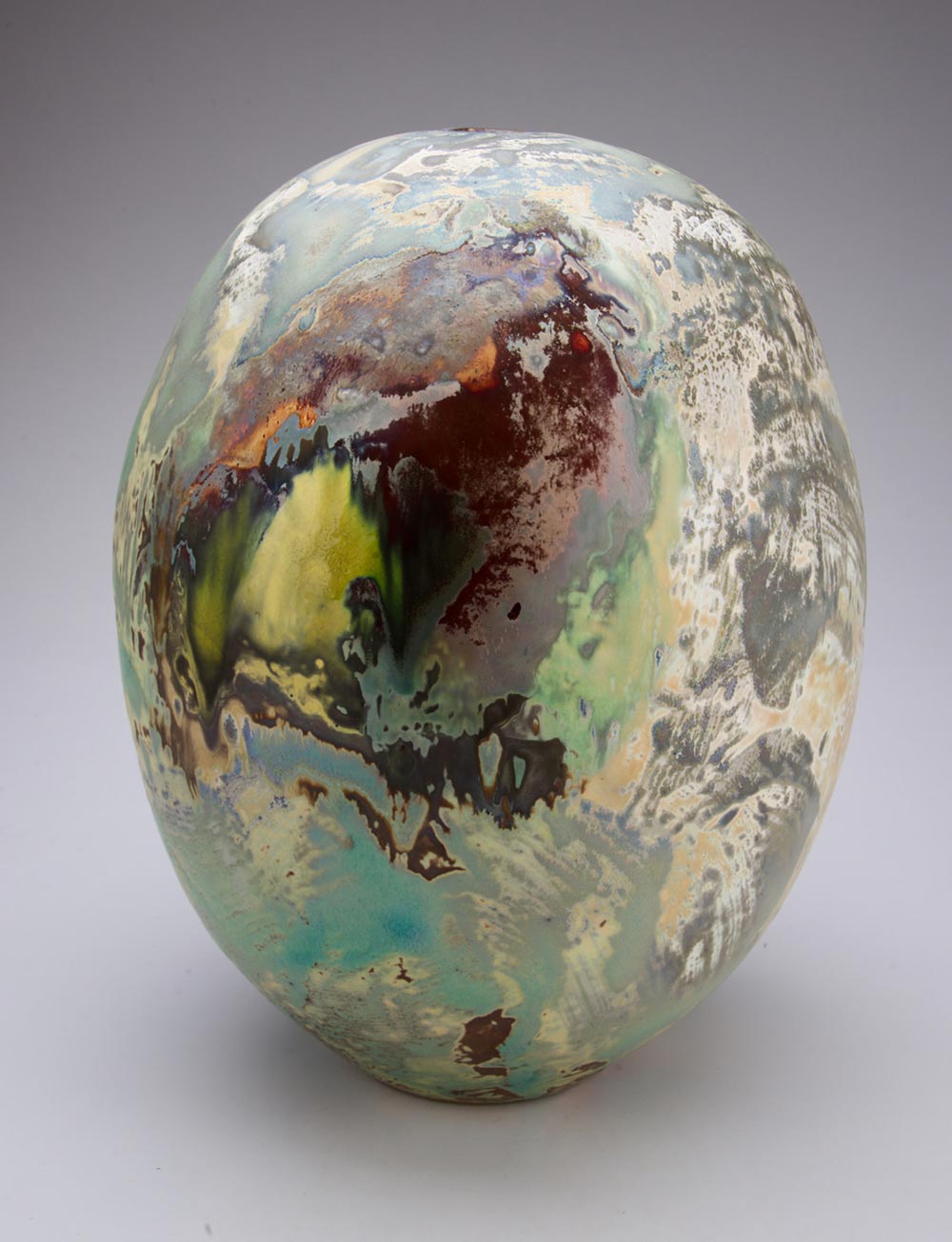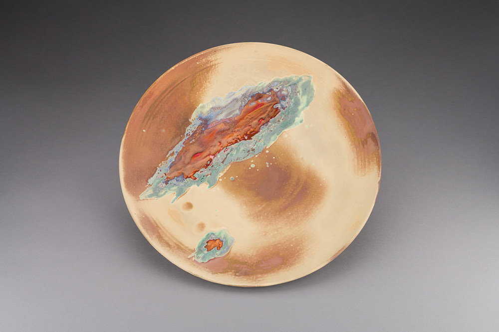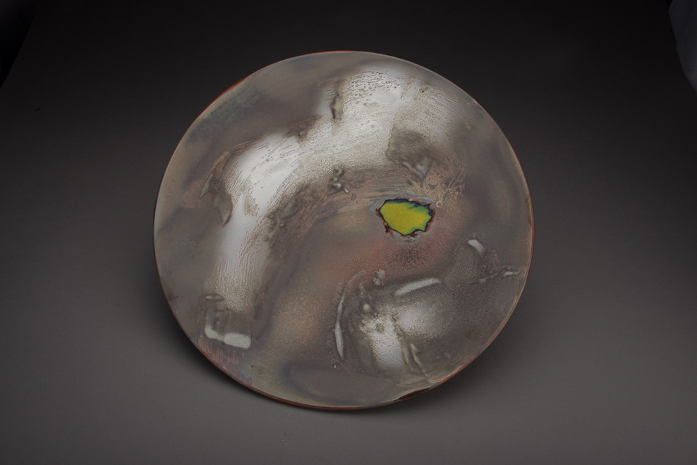 The surrounding land, sky, light, I see from my studio have been distilled into my work. This work draws upon light and interaction with the atmosphere and environment. This pieces capture light during a storm at sunset. The importance of light itself interacting with the lustre surfaces of the work.