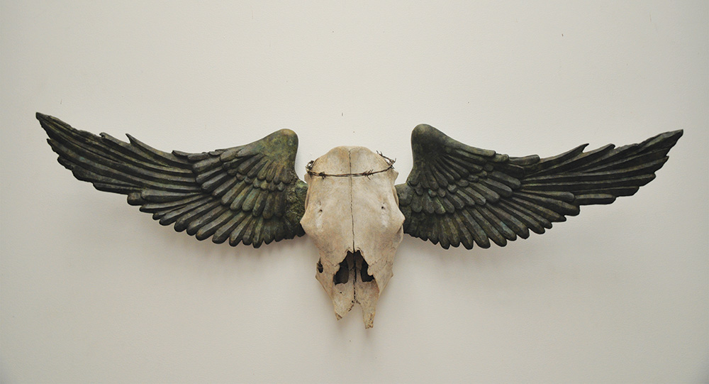 Holy Cow 2025 - cow′s skull, bronze wings(ed of 1/3), mild steel. The Delusion - A playful look at the religious idolatry, twisting paradigms with India′s sacred cow crowned by thrones and adorned by the wings of an angel. Presented as a trophy kill.
