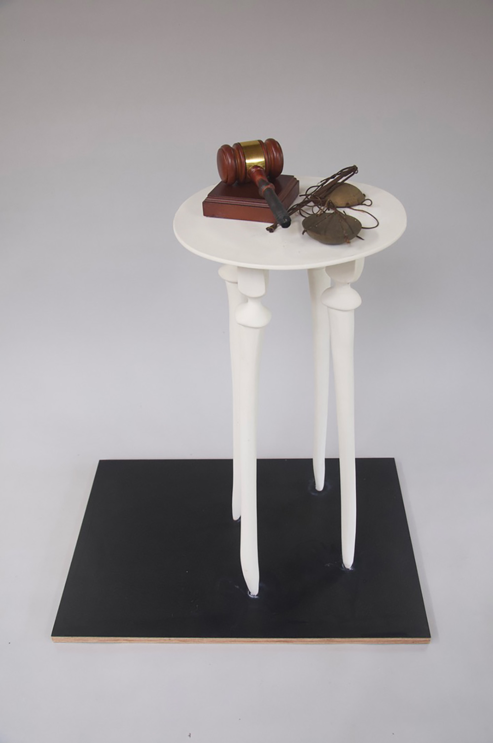 Diminished Justice 2025. porcelain, burnt wooden gavel, antique scales, 72 x 38 cms The Delusion: