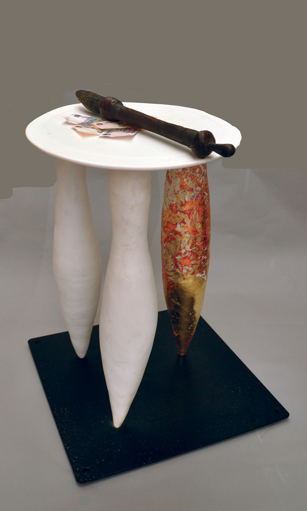 Papered Over 2025 - porcelain, archival ink jet prints. Papered Over or rather Bretton-Woods is Broken 2025 The Delusion: This sculpture critiques the fragile illusion of the financial system by visualizing the act of ‘papering over” – a practice where bankers and lawmakers use a veneer of officiality, complex regulations and perceived trust to conceal an inherently unstable core. The work further dissects the central delusion of money itself: the belief in its solid and permanent value. In reality, this “solidity” is a social construct, a precarious illusion built on a foundation of speculation, debt and empty promises “IN GOD WE TRUST” on American fait currency