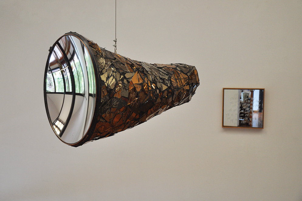 The Hypocrite 2025 - Repurposed army searchlight mirror, tinted mirror, steel, fibreglass. This piece explores the architecture of hypocrisy. The delusion of the belief in a stable unified self. This sculpture argues that the self is an illusion - a makeshift collage of external interpretations, constantly flux and never truly whole. Within it the broken mirrors reveal the fragmented and distorted nature the viewed through the lens of self. The word ′moi′ etched on every shard, represents the core of hypocritical action; the perpetual exception we make for ourselves, the self interest that fractures our integrity. The piece is not a condemnation, but an invitation for the viewer to confront the hypocrite we all risk becoming, bouncing back at us in a thousand broken ways.