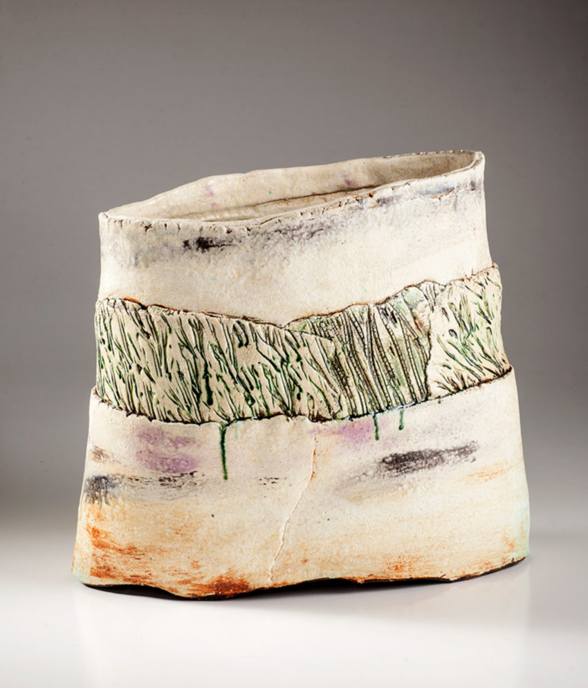 Reconstructed Landscape II Large hand-built elliptical form multi-glazed and multi-fired 2026 44H x 49W x 24D cm $7000
