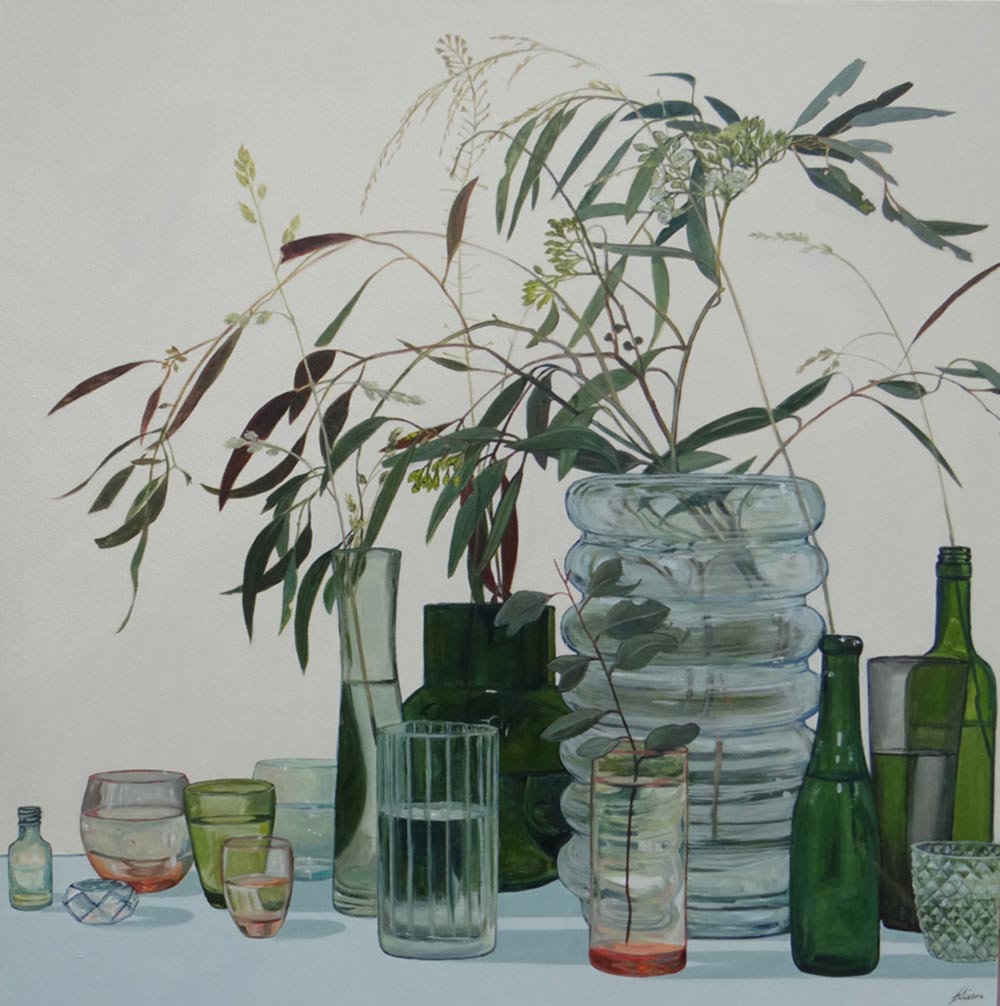 Intermingling and entwining plants rise amidst fragile collections of glassware. This diverse glass collection ranges from fine crystal to utilitarian jars, that echo the lived-in elegance of belongings inherited, gifted and acquired over time.