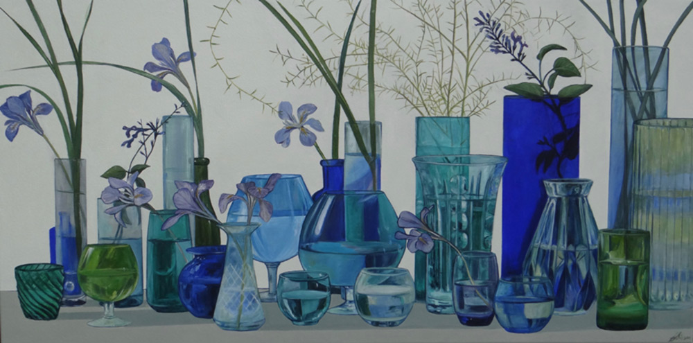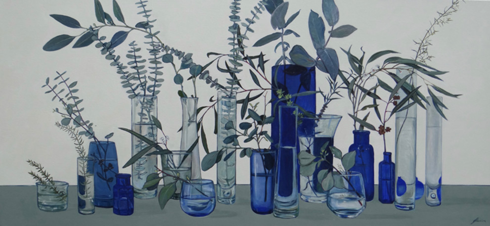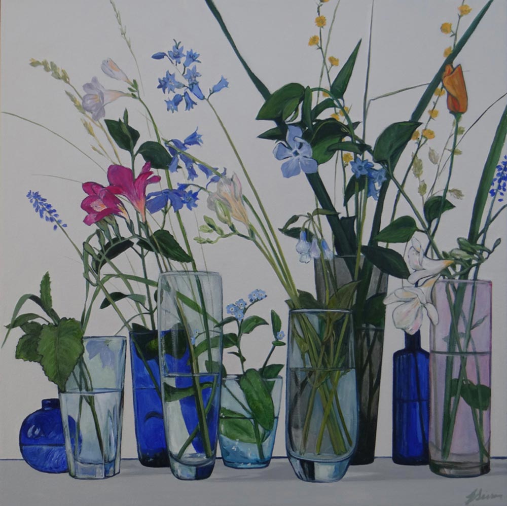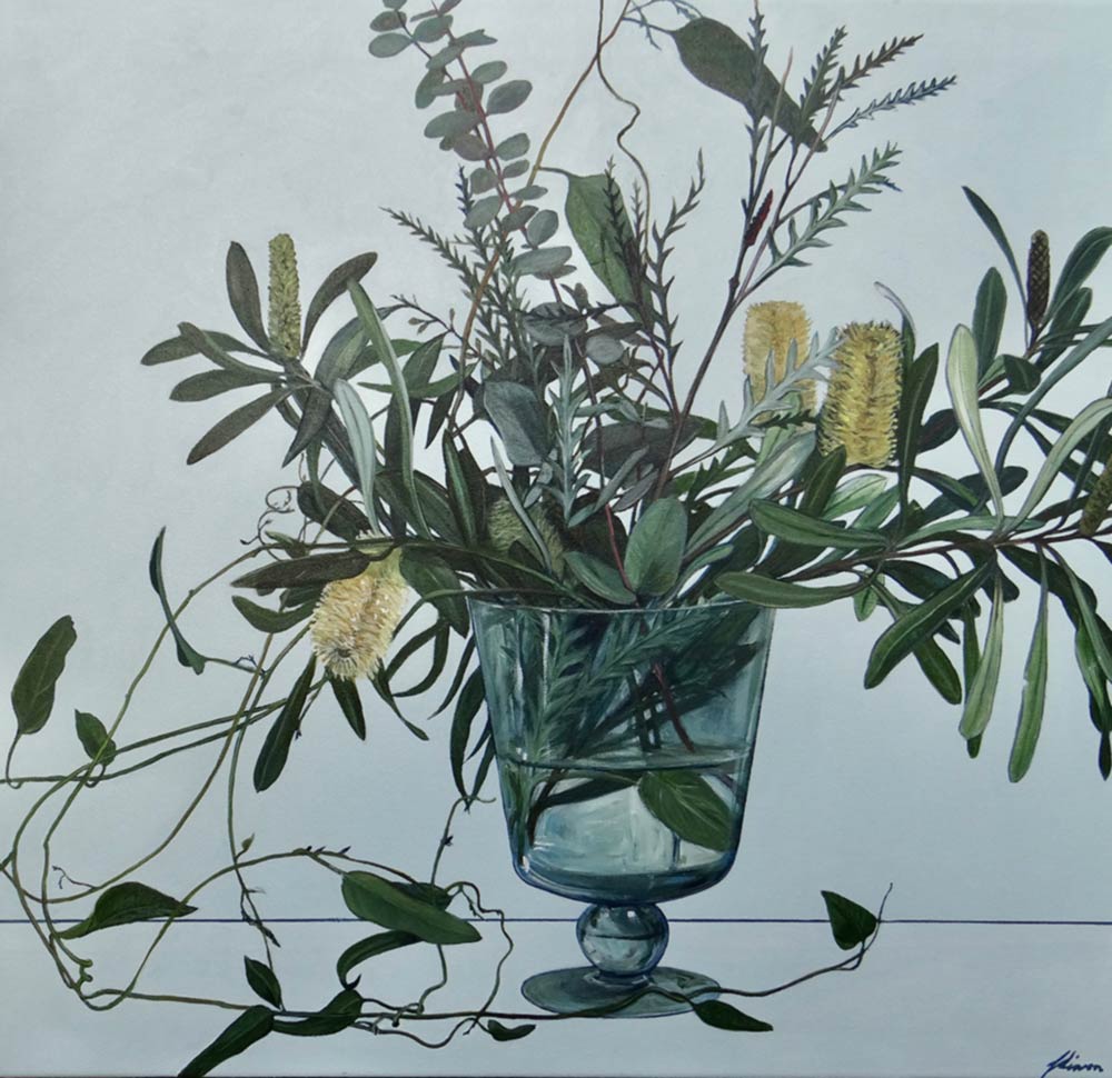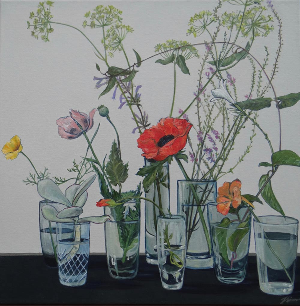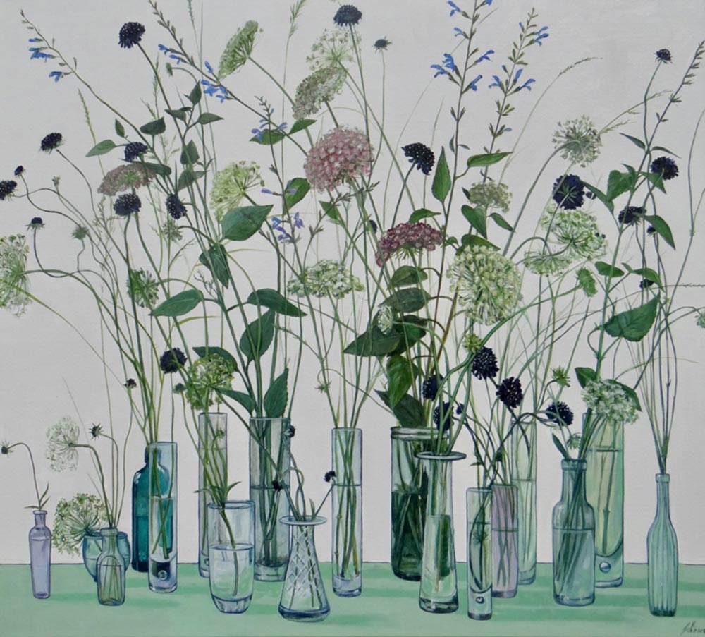 My recent still-life paintings combine a love of the untamed and wild nature of flowers, grasses and tree foliage.